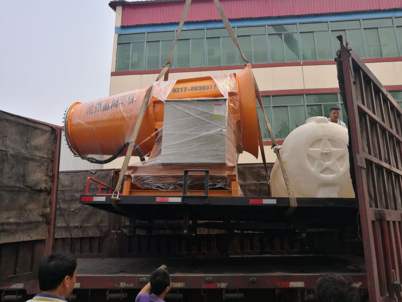 100米射程除塵噴霧機是我公司生產(chǎn)的較大型號的除塵噴霧機之一,自重2.3噸,風(fēng)機長(cháng)度接近3米,這種高射程的大型設備有時(shí)候裝車(chē)也是一件很費勁的事,由于體積較大,一般車(chē)間吊裝很難完成因此這種大型設備裝車(chē)一般使用大型吊車(chē)裝車(chē), 近大射程除塵噴霧機一直在出貨,很多揚塵企業(yè)也在不斷的 新除塵噴霧機,從小型號到大型號發(fā)展。